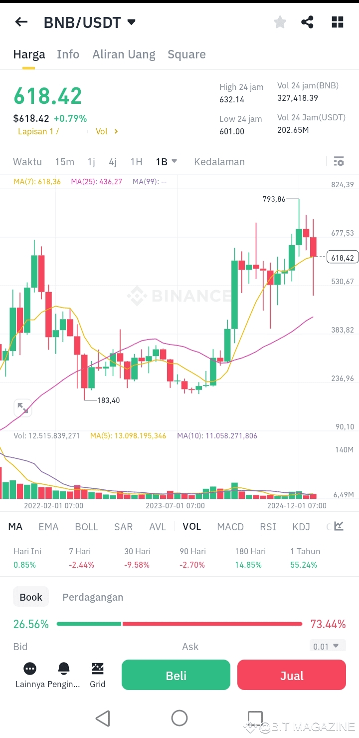 3.Volume perdagangan yang tinggi dan market capitalization yang besar: Volume perdagangan yang tinggi menunjukkan bahwa token BNB memiliki likuiditas yang baik, artinya ada banyak pembeli dan penjual yang aktif di pasar. Hal ini membuat harga BNB lebih stabil karena ada banyak pihak yang terlibat dalam perdagangan token BNB. Market capitalization yang besar juga menunjukkan bahwa token BNB memiliki nilai pasar yang signifikan, sehingga membuat harga BNB lebih stabil karena ada banyak investor yang memiliki token BNB.