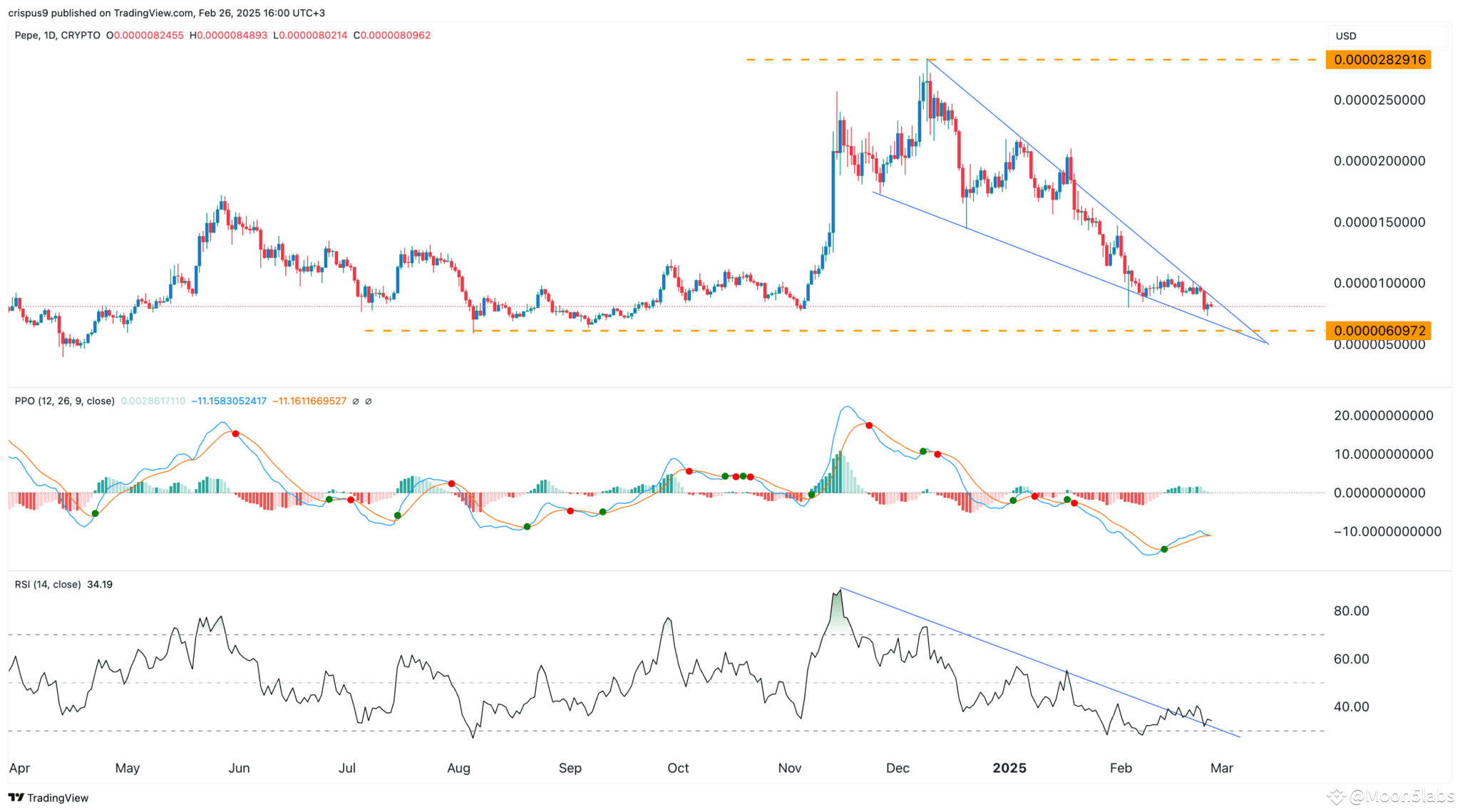 Since these lines are approaching a confluence point, Pepe Coin’s price could soon rebound and start an uptrend.