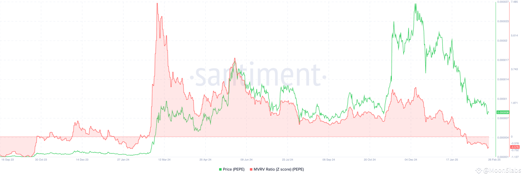 📊 Santiment data shows that MVRV-Z peaked at 2.74 in November, following a consistent downtrend as the coin’s price declined. It has now hit -0.576, a level last seen in February of last year—back then, Pepe Coin experienced a massive rally.