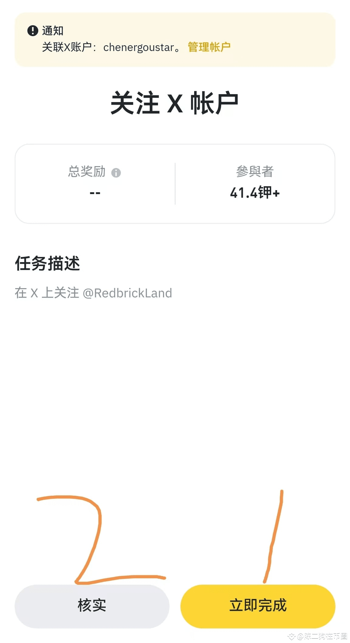 打开币安web3钱包,找到奖励任务,进入,前面两个比较简单的任务还是关注推特(这里需要开梯子)点击完成任务,关注了点击核实即可。第二个不用打开关注币安钱包的,之前做过直接验证即可。