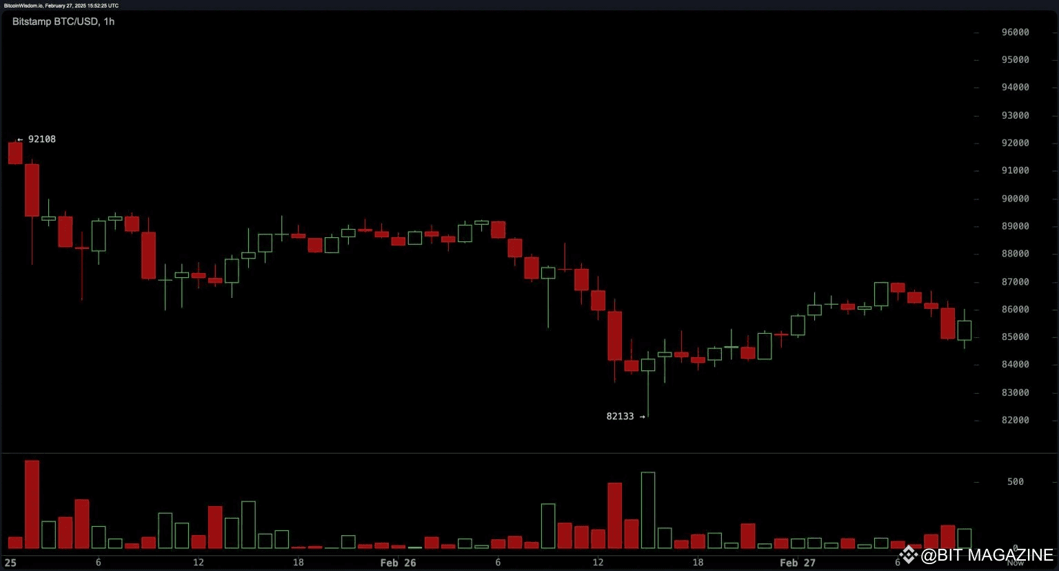 Bitcoin‘s 1-hour chart signals a slight recovery following a local bottom at $82,133, with buyers stepping in to stabilize prices. However, resistance at $86,000 remains a critical barrier, preventing a stronger upward push. If bitcoin holds the $84,000–$85,000 range, a breakout toward $88,000 is possible. A failure to maintain this support level could lead to a retest of $82,000, reinforcing the broader bearish sentiment.