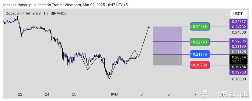 На графіку DOGE на годинному таймфреймі формується бичачий патерн «голова і плечі», і існує сильний рівень опору з верхньої сторони. Якщо ринок прорве цей опір, можливо, ми зможемо зайти після повторного тестування цього рівня. Це може бути сигналом того, що в ринку може бути потенційний висхідний тренд, і до такої ситуації руху слід приділити увагу та інвестувати відповідно до плану.
