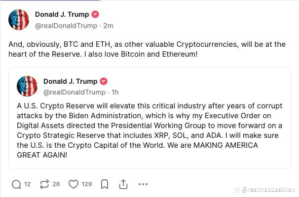 In his latest tweet, Trump emphasized that BTC and ETH are central to this new reserve, calling them "valuable cryptocurrencies." His Executive Order on Digital Assets directs the Presidential Working Group to fast-track this crypto strategy, including XRP, SOL, ADA, and of course, Bitcoin. 💥
