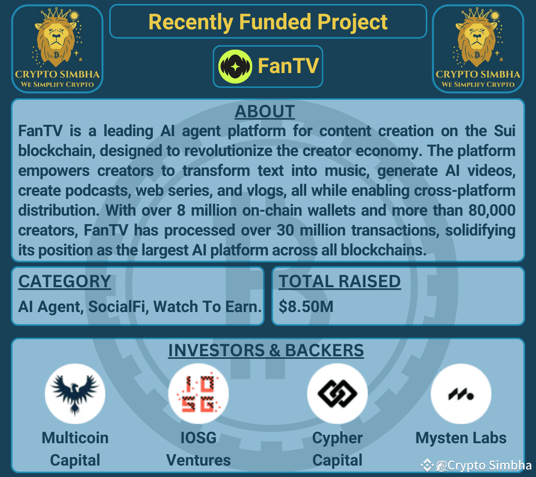 🔹About: FanTV is a leading AI agent platform for content creation on the Sui blockchain, designed to revolutionize the creator economy. The platform empowers creators to transform text into music, generate AI videos, create podcasts, web series, and vlogs, all while enabling cross-platform distribution. With over 8 million on-chain wallets and more than 80,000 creators, FanTV has processed over 30 million transactions, solidifying its position as the largest AI platform across all blockchains. The project recently secured an additional $3 million in strategic investment from Mysten Labs, Cypher Capital, CoinSwitch Ventures, and Illuminati Capital, building on its earlier $5.5 million raise. FanTV's economic model combines paid AI-powered content creation tools with engagement rewards, allowing users to purchase credits for premium features, tip and gift creators, and launch their own tokens for exclusive content. Under the leadership of CEO Prashan Agarwal, former CEO of Gaana, FanTV aims to democratize content creation and empower millions of creators to express their unique voices through AI-powered tools. The platform hosts notable content leaders and emerging creators, bridging the gap between talent and established influencers. FanTV's innovative approach to creator monetization and its robust AI technology make it a key player in the future of content creation.🚀🌐