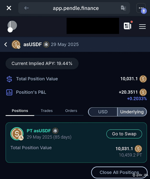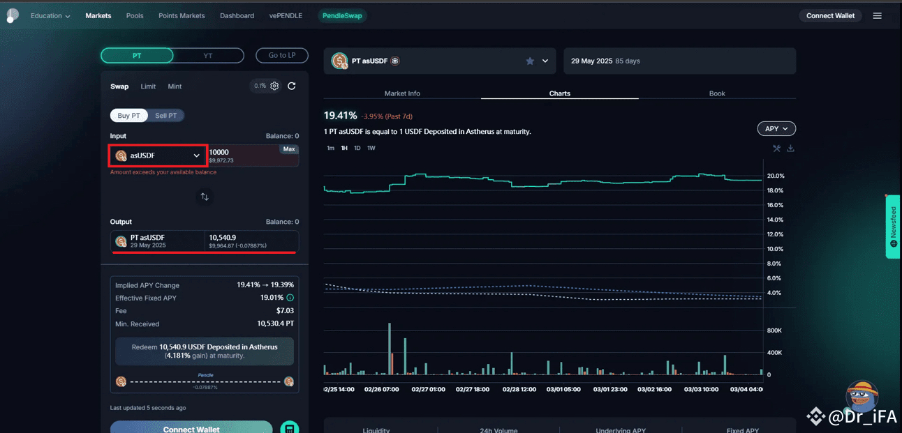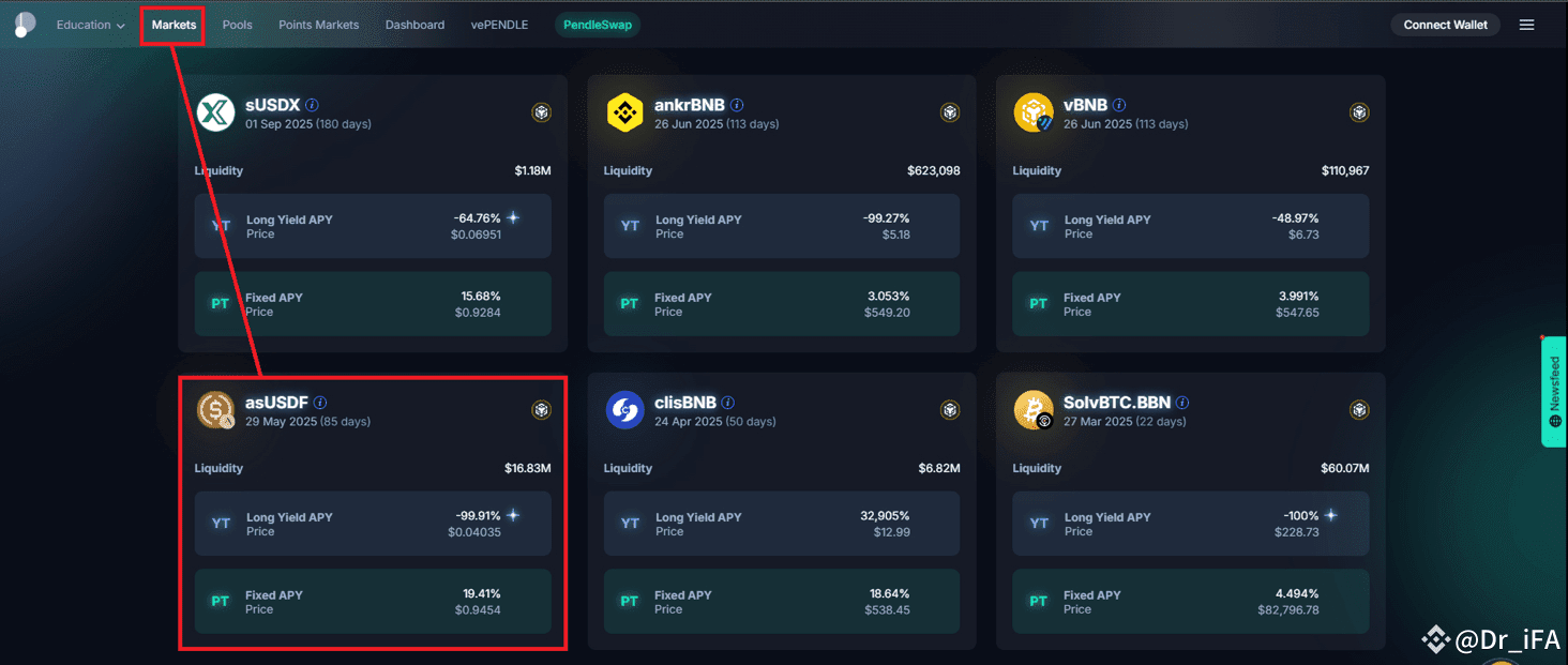 進入Pendle官網>>>點選「Markets」>>>選擇「asUSDF」(目前只有一個85天後到期的池子可選擇)