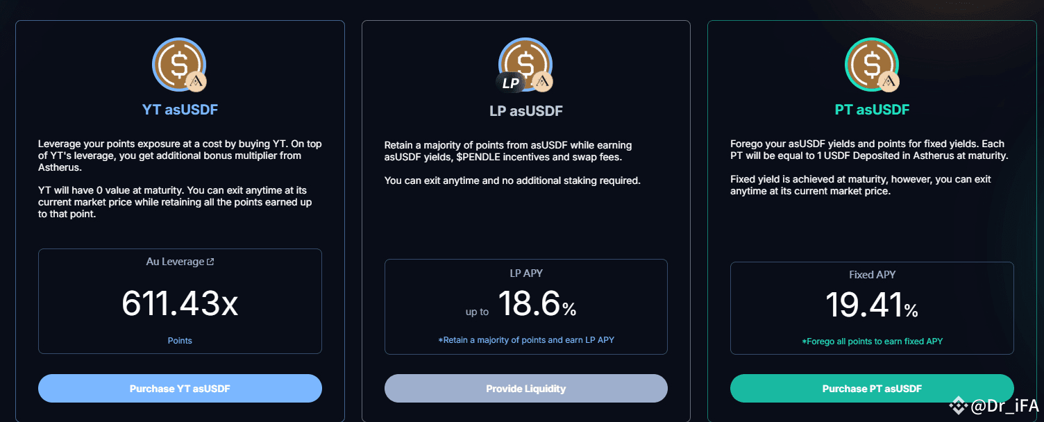 最頂的DeFi協議$PENDLE 最近推出基於#Astherus USDF的利率交易市場!除了滿足空投獵人們槓桿追求積分的需求,針對瞄準穩定收益的玩家也提供了高額的固定年化。用簡單的文字來描述說明Pendle產品的話,可以概括成以下幾種: