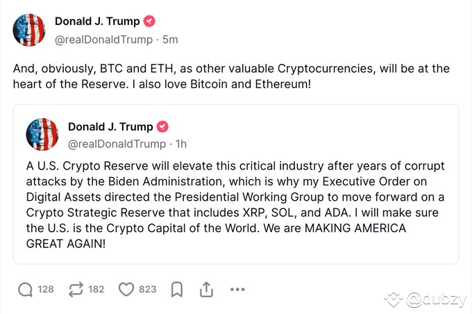 ❍ On Sunday, President Trump announced the creation of a U.S. strategic crypto reserve, including $BTC, $ETH, $SOL, $XRP, $ADA