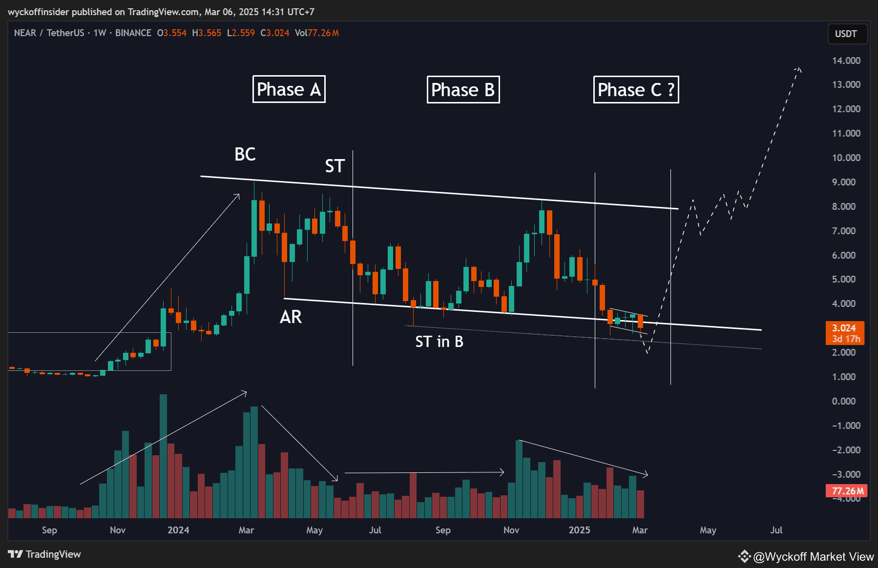 Như vậy chúng ta có đầy đủ lý do để tin rằng NEAR đang trong mô hình tích lũy trên khung weekly. Tuy nhiên đây là cấu trúc dốc xuống và dấu hiệu ở volume cho thấy nguồn cung ở phase C vẫn còn tương đối lớn, vì vậy trong ngắn hạn có thể giá sẽ tiếp tục side way và cần phải có một cú test lại mức 2.5 trước khi chuyển sang phase D - giai đoạn tăng giá.