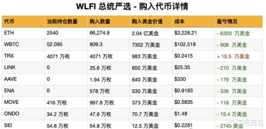 至此,WLFI 已累计花费 3.09 亿美金主动购入 9 种代币;因 AAVE / ONDO 等代币昨日上涨,此次加仓后的累计浮亏缩窄至 8096 万美金,其中 $TRX 是唯一转亏为盈的标的