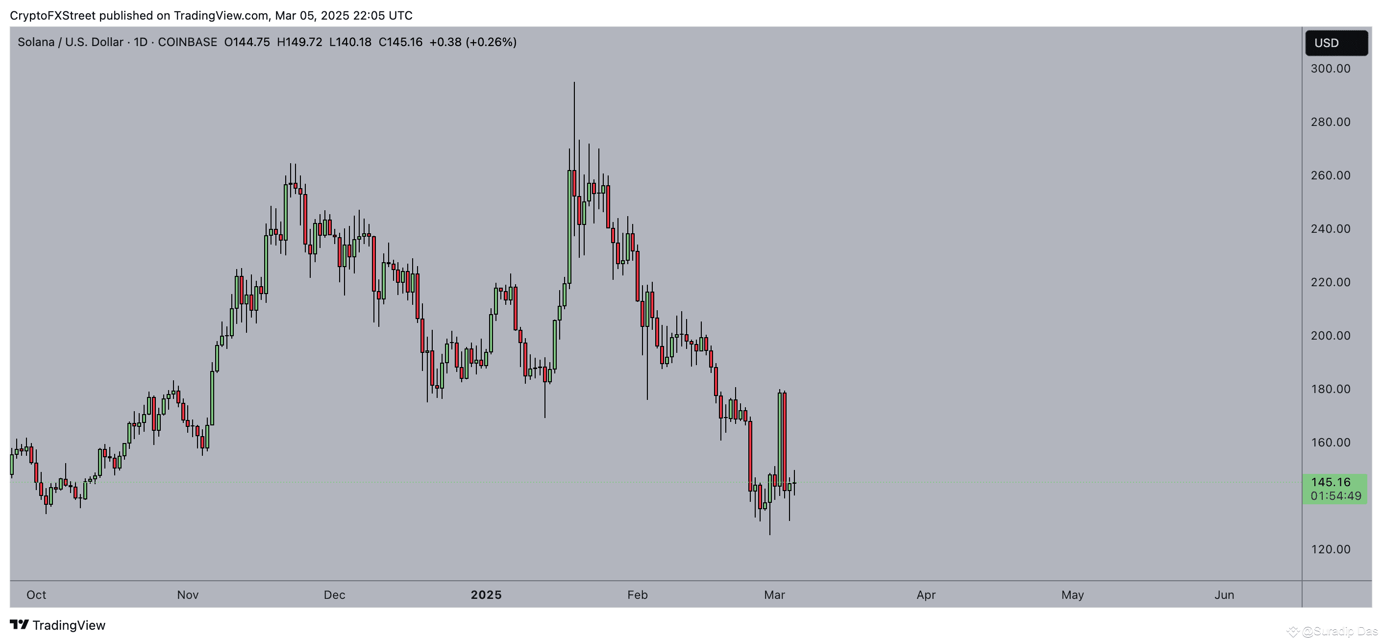 Solana price hovers around $145, attempting to stabilize after a recent rebound from local lows.