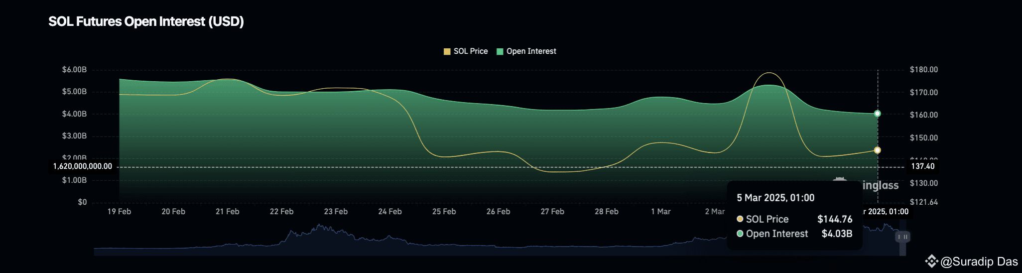 SOL open interest has hovered around $4 billion since Monday, as speculative traders remain hesitant about entering new positions.