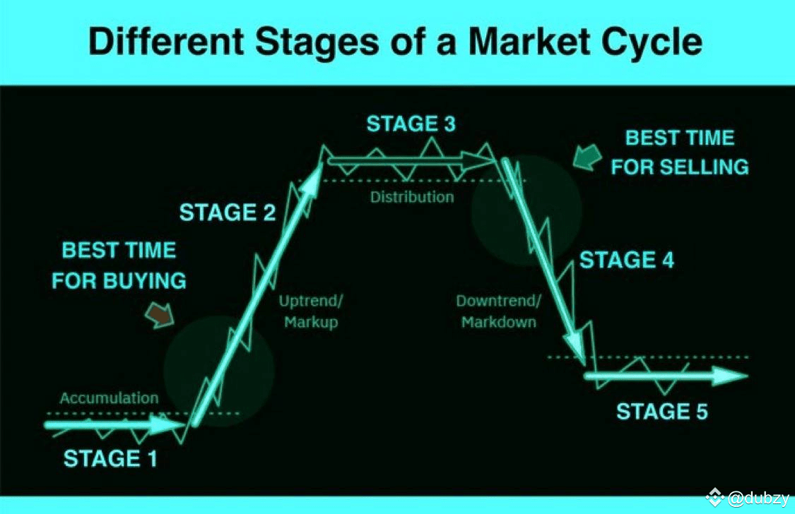 â Market cycles in crypto follow four distinct stages: accumulation, uptrend, distribution, and downtrend.