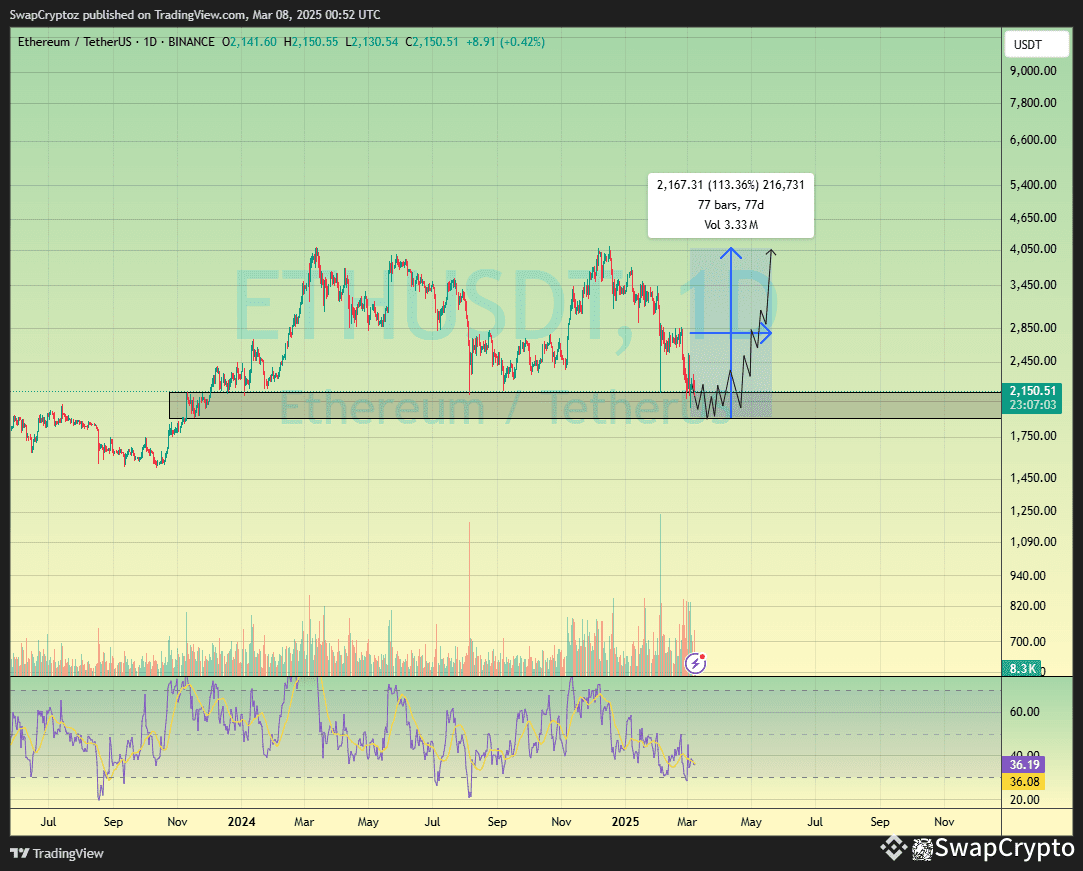 This is a 1-day Ethereum (ETH/USDT) chart from Binance, showing a potential recovery after a downtrend. The price is currently at $2,150, bouncing from a strong support zone. The chart suggests a bullish breakout with a projected target of around $4,300, indicating a possible 113% increase in 77 days. The RSI at the bottom is near 36, signaling an oversold condition, which could support a price reversal. Volume activity shows increasing interest, and the price action hints at an upward movement with minor pullbacks along the way. So I think ETH is Bullish For Longer Time Frame .