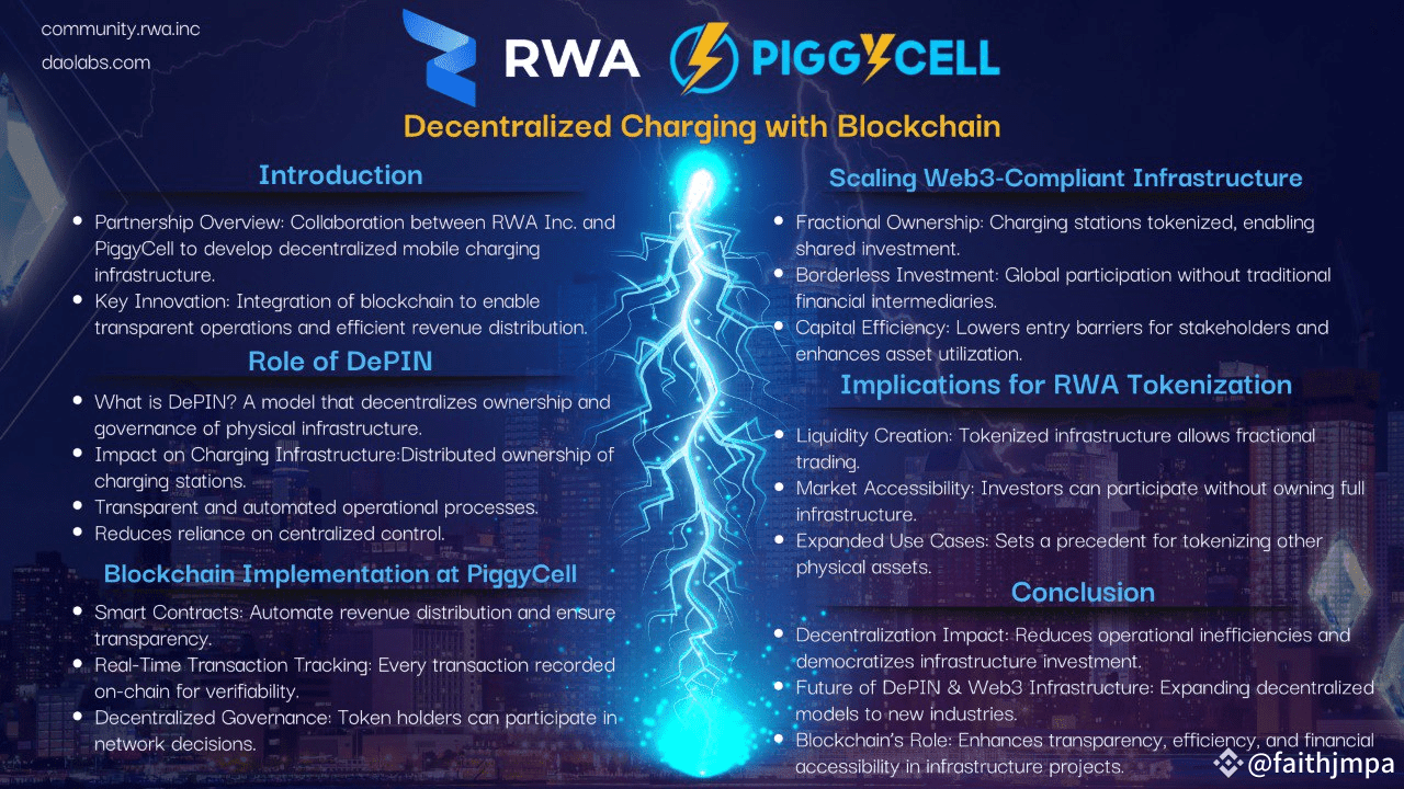The partnership between #RWA Inc. and #PiggyCell represents a significant step toward integrating decentralized infrastructure models with blockchain technology. This collaboration exemplifies the potential of Decentralized Physical Infrastructure Networks (DePIN) to reshape asset ownership, operational efficiency, and revenue distribution frameworks in the charging infrastructure sector.