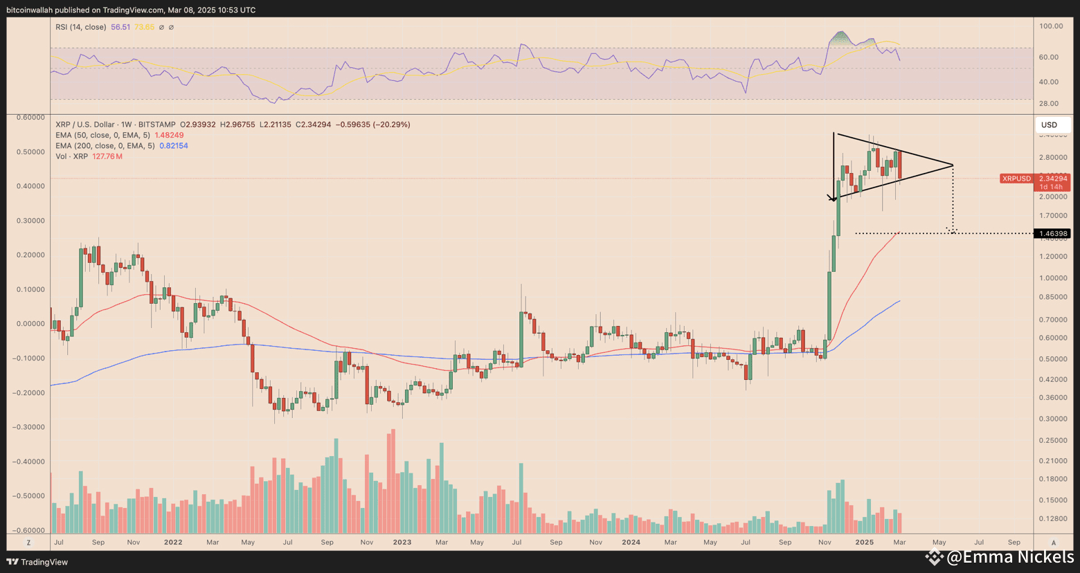 • Applying the same pattern to XRP, the target price could drop to $1.46, aligning with the 50-week EMA.