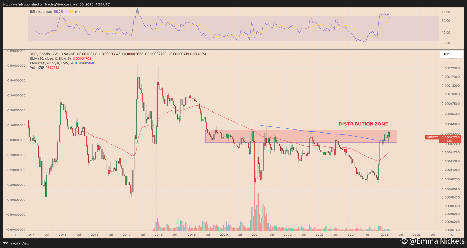 • XRP/BTC at a critical level: A break below 200-2W EMA (2,459 satoshis) could push it down to 1,700 satoshis, reinforcing the bearish case.