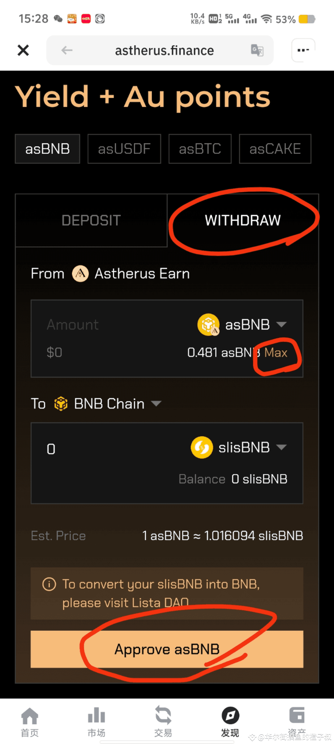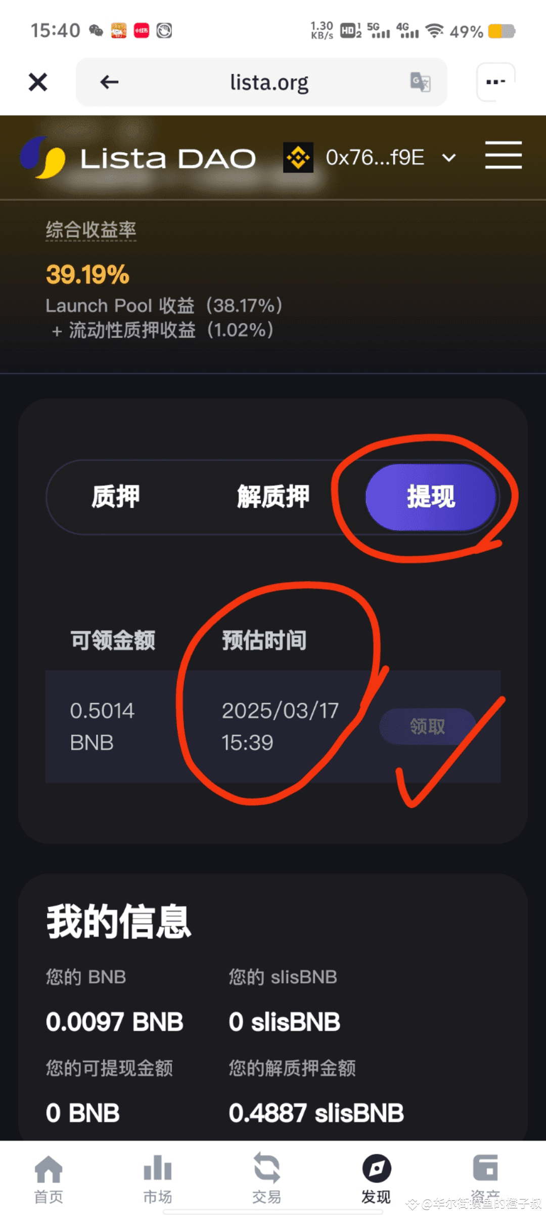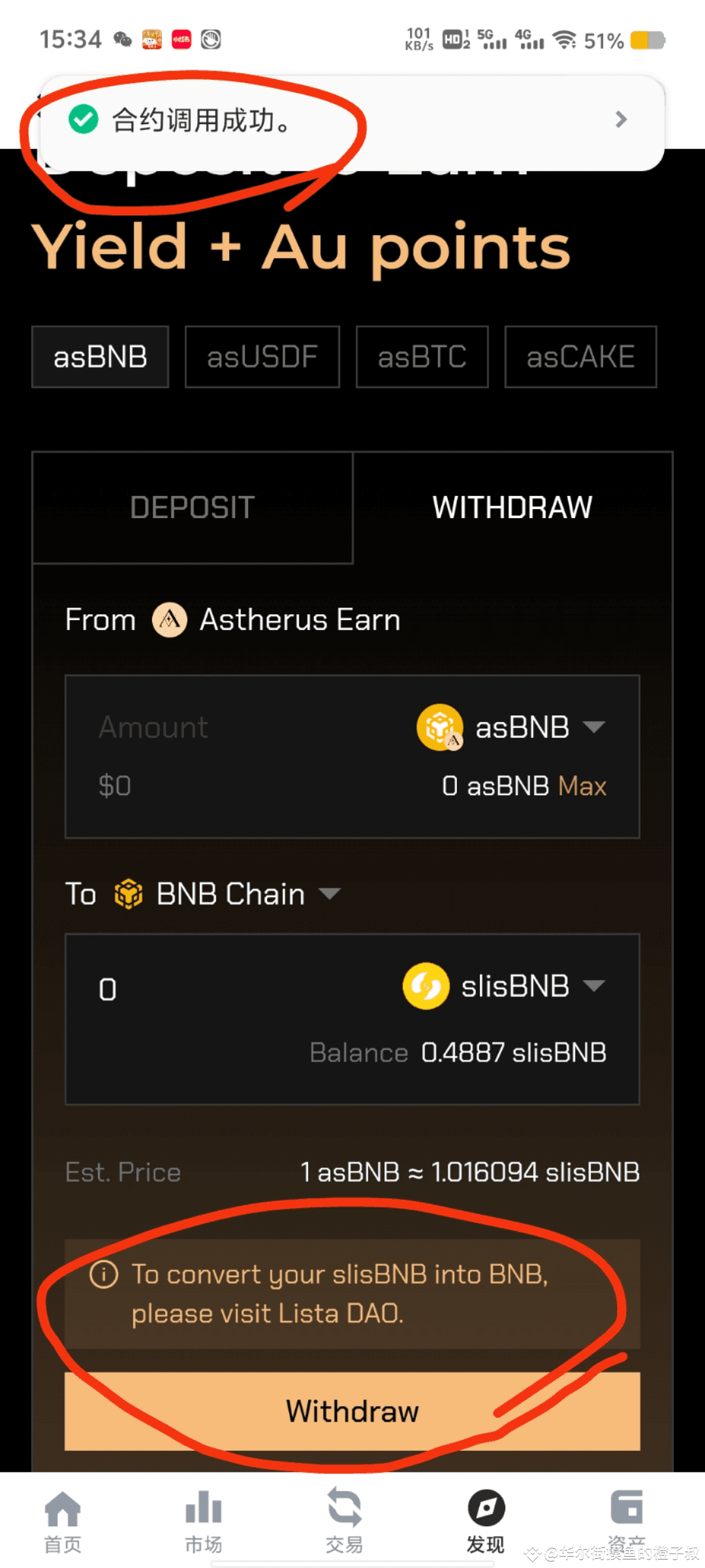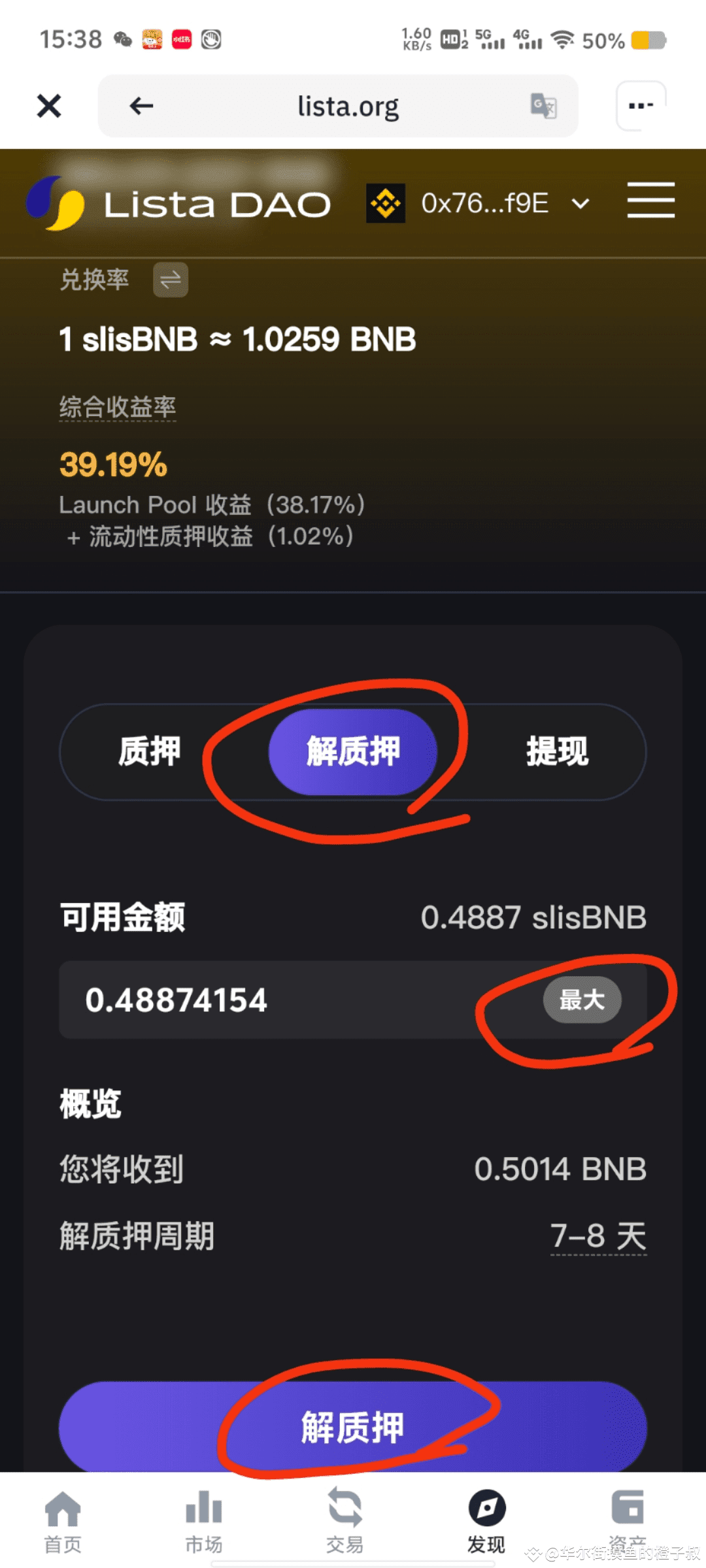 第三步,到Lista DAO上将slisBNB赎回为BNB