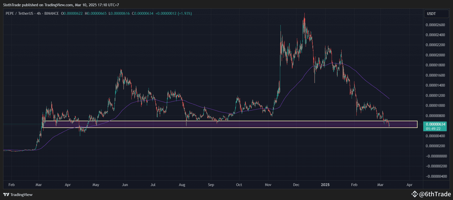 PEPEUSDT is currently trading at 0.00000633, showing a slight increase of +1.77%. The price has been in a consolidation phase with some volatility. The 200-period moving average is acting as resistance, positioned at 0.00000872, and the price is currently well below this level.