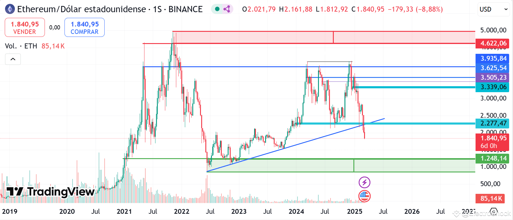 Hola. Hoy quiero compartir contigo un análisis detallado sobre Ethereum (ETH) basado en gráficos semanales. Este enfoque es a largo plazo, y aunque no hay garantías en este mercado, creo que entender estos niveles clave puede ayudarnos a tomar decisiones más informadas. Vamos a profundizar.