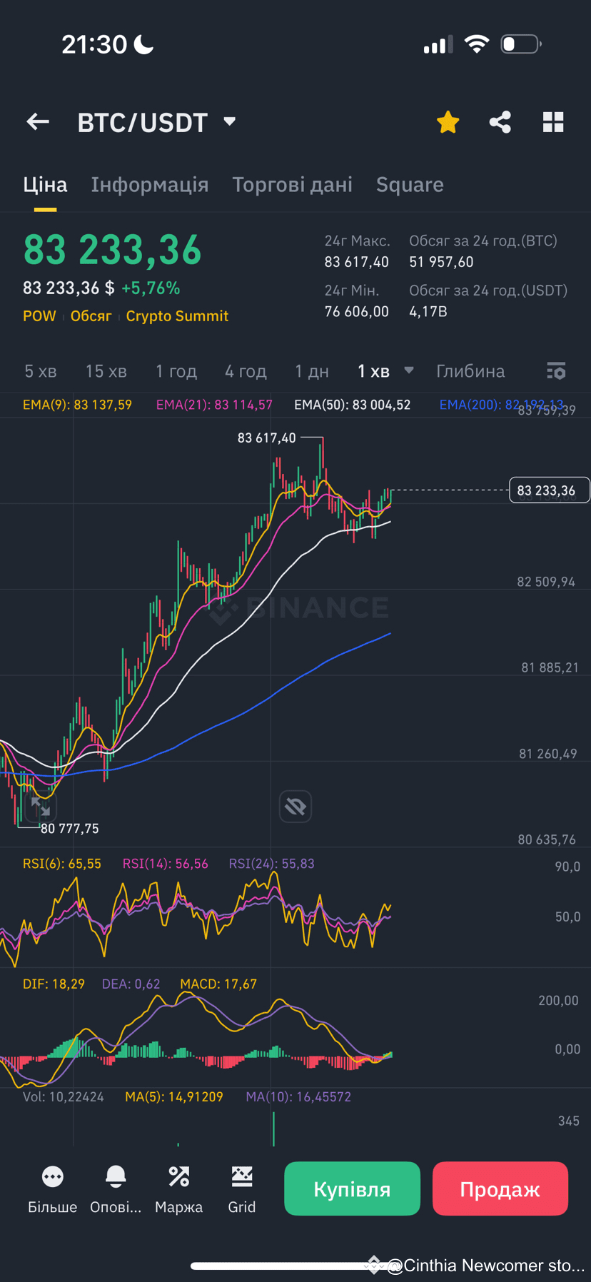 На 1-хвилинному графіку видно короткостроковий висхідний тренд – ціна зростає, EMA(9) та EMA(21) підтверджують моментум, RSI знаходиться в нейтральній зоні. На такому таймфреймі трейдери можуть бачити швидкі коливання та відкривати угоди на кілька хвилин або годин. Важливо пам’ятати, що такі рухи не гарантують довготривалого зростання, і ціна може різко змінити напрям.
