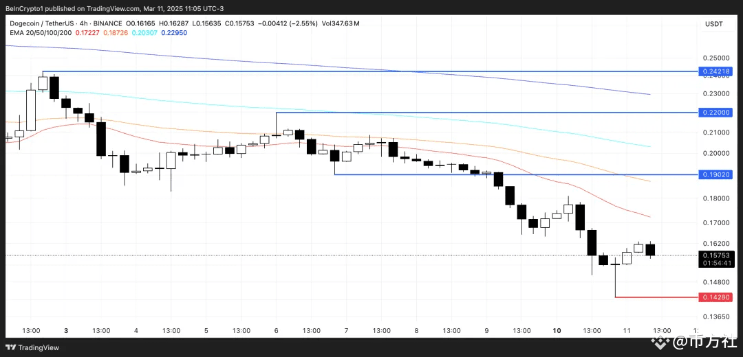 如果当前的下跌趋势延续,DOGE可能会测试0.142美元的关键支撑位。若该支撑位失守,DOGE可能自2024年10月以来首次跌破0.14美元,进一步下探更低水平。