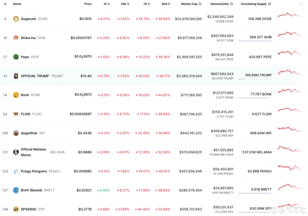 狗狗币今日的下跌趋势反映了memecoin领域当前普遍的看跌情绪。
