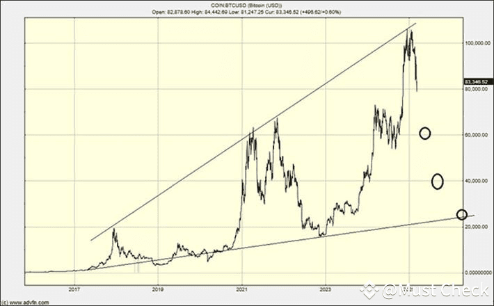 In this chart, you can clearly see the cycles and their progression. The circled areas represent the price levels I anticipate bitcoin might fall to; the higher values represent what I believe are more likely targets. A drop below $30,000 seems unlikely, although it’s hard to judge in these hyper-volatile times.