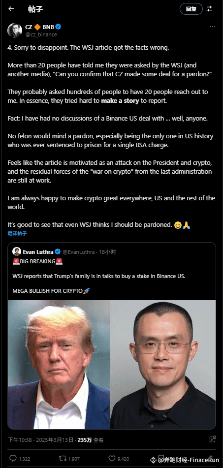然而,Binance创始人CZ(赵长鹏)很快发布推文出面辟谣,称这一消息“100%错误”。他表示,仅昨天早上就有超过20人向他确认特朗普家族是否要收购Binance.US的股份。CZ明确表示,自己从未与任何人讨论过Binance.US的交易或出售事项。