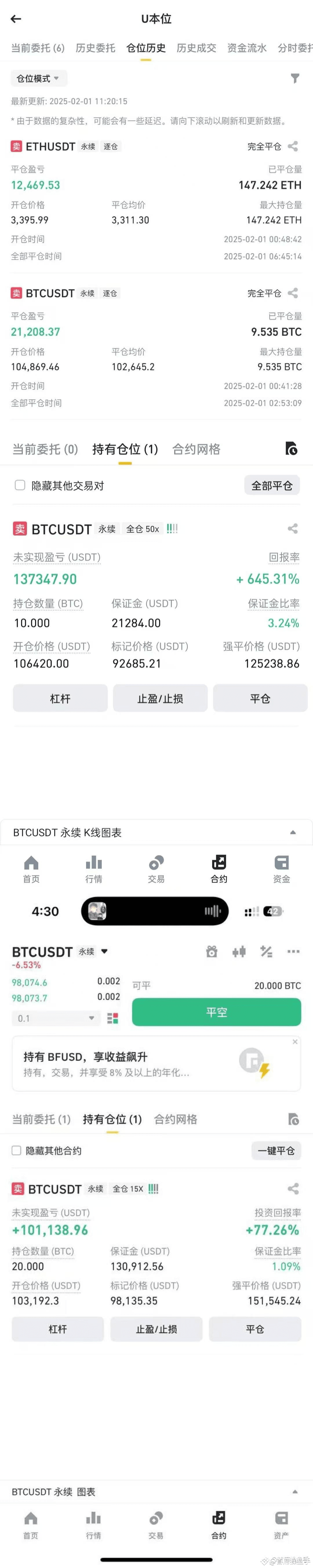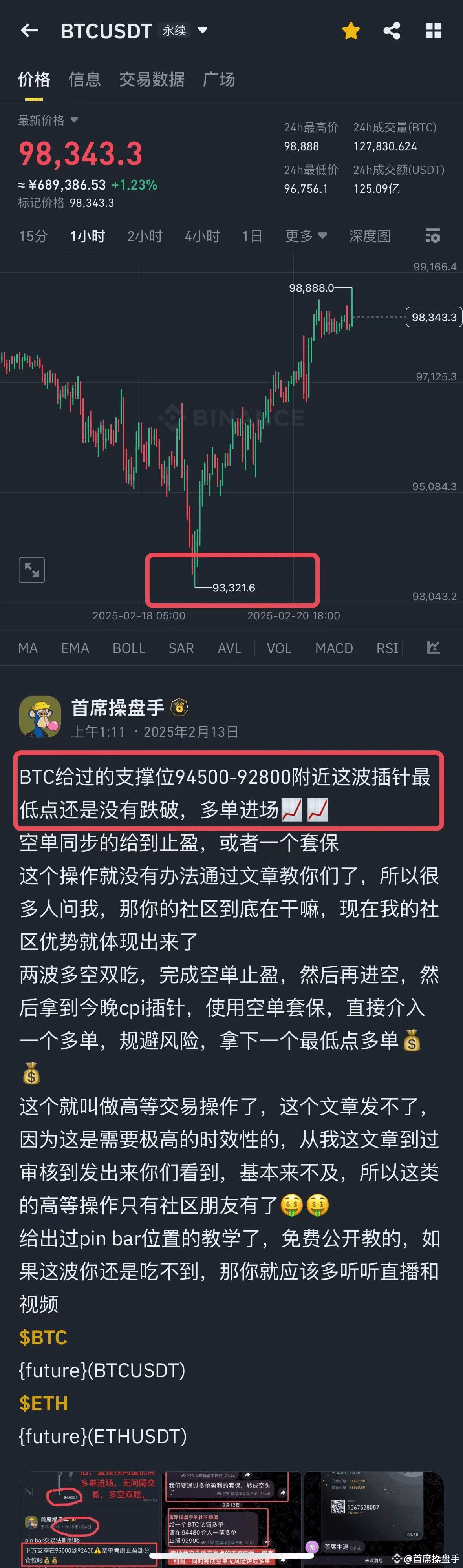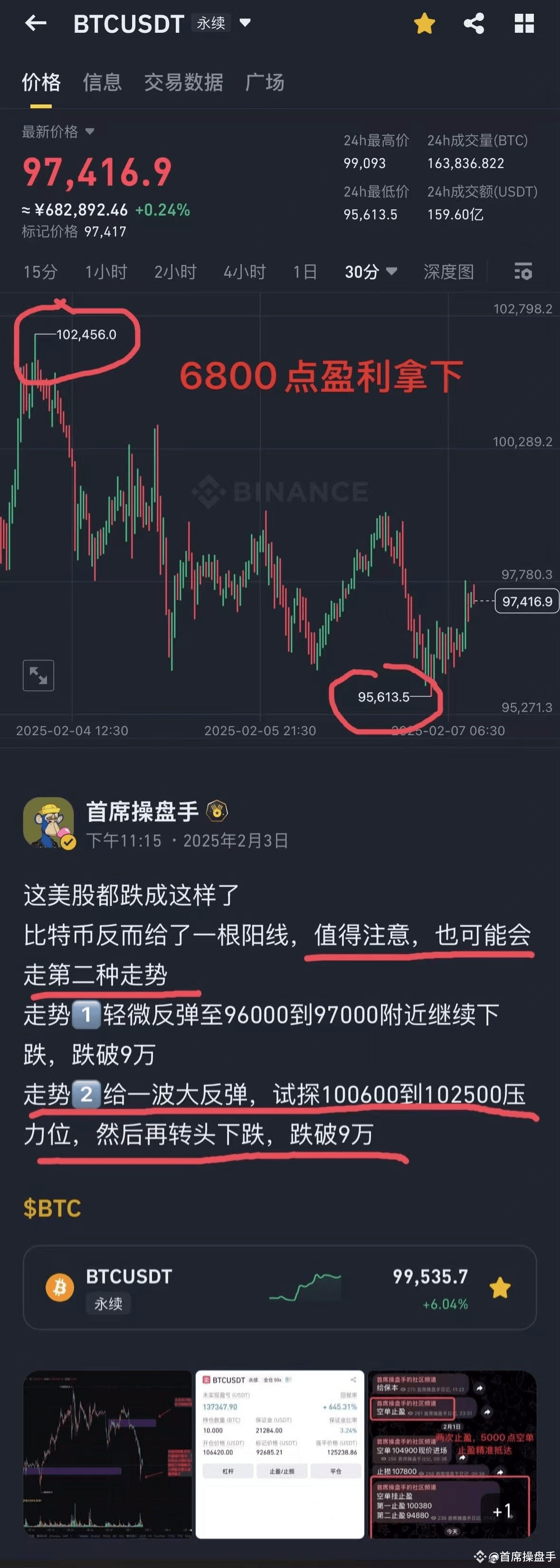 从最开始107000空单91000止盈,再把止盈的空单101620接回,再到94000止盈,再到2月21日这一波把止盈的空单98300接回,一路拿到2月2日月初预判的跌到88000,整整提前一个月预判行情走势,并且灵活止盈三次以后再最高点接回空单,吃下一个月内所有跌幅同时全部最高点接回空单,空单盈利超3万点💰💰