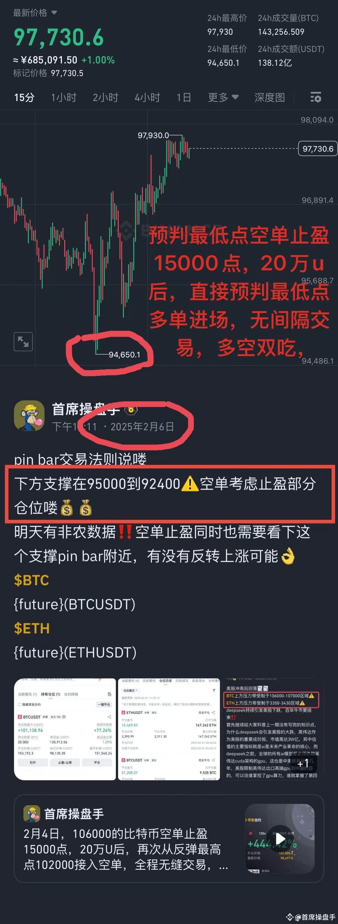 95000多单进场进场过后再次发文97400附近开始做空,多空双持,应对2月份长达14天的宽幅震荡