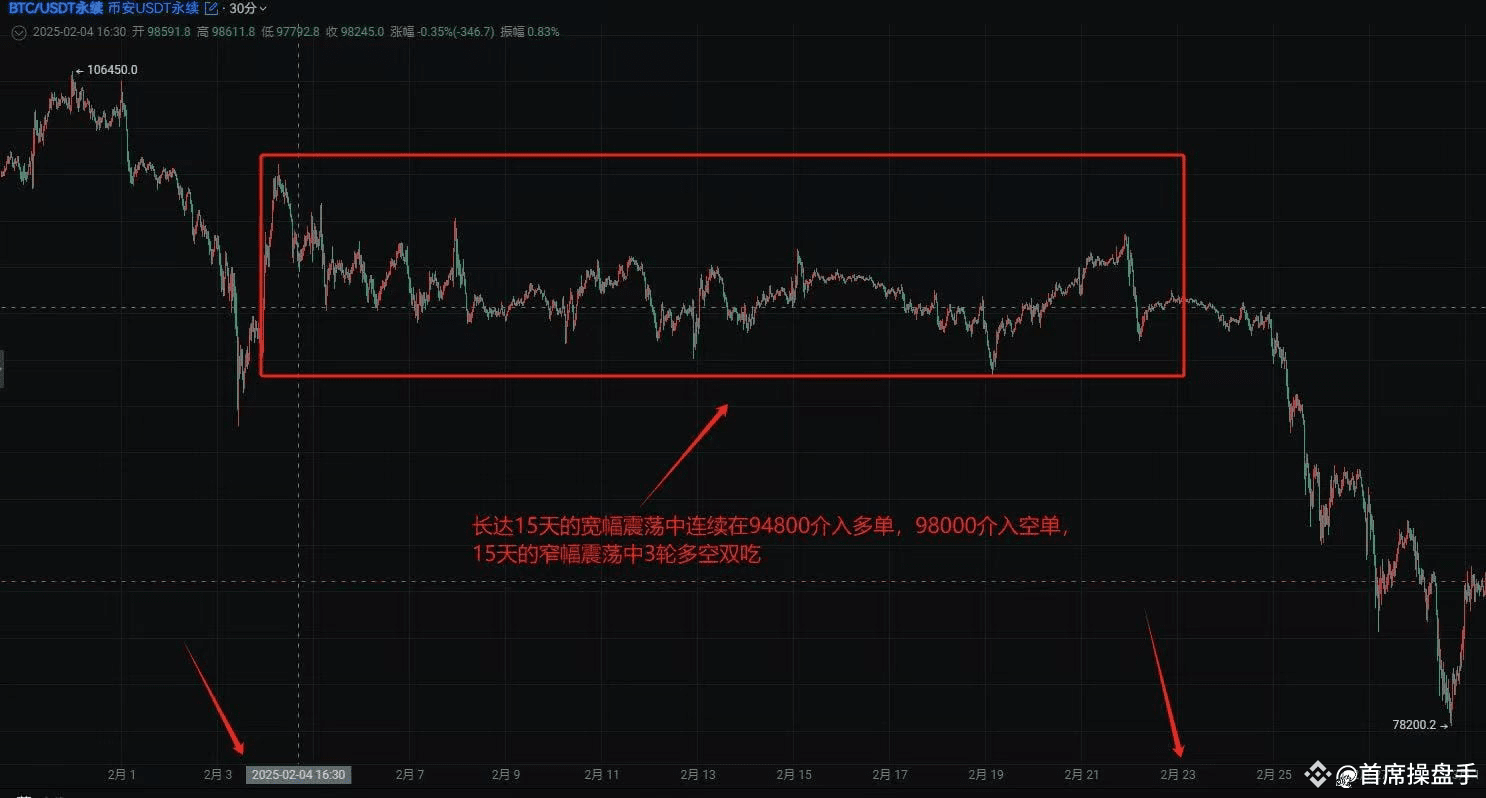 在2月份连续15天的在94800到98000的窄幅震荡中连续3轮多空双吃,下图可以看到在94800到98000区域连续15天震荡,我们连续在震荡边缘最高点98000做空,和最低点94800做多3轮