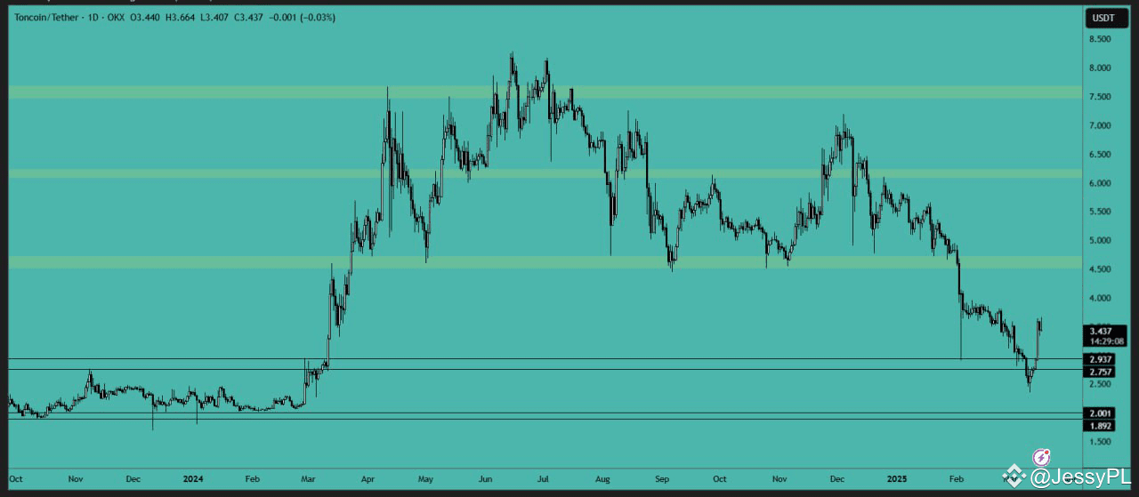 The price has fallen below the major support area to collect liquidity and then quickly rebounded. You can consider accumulating some TON during dips near this support level (below the $3.30 level). If the price manages to break through the local resistance area, we could see a rally toward the major resistance area.