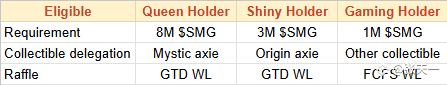 作为女王持有者的特别福利,我们还会为您从SMG抽奖中赢得的任何白名单(WL)名额进行铸造。您无需担心費用,我们会为您提供支持。