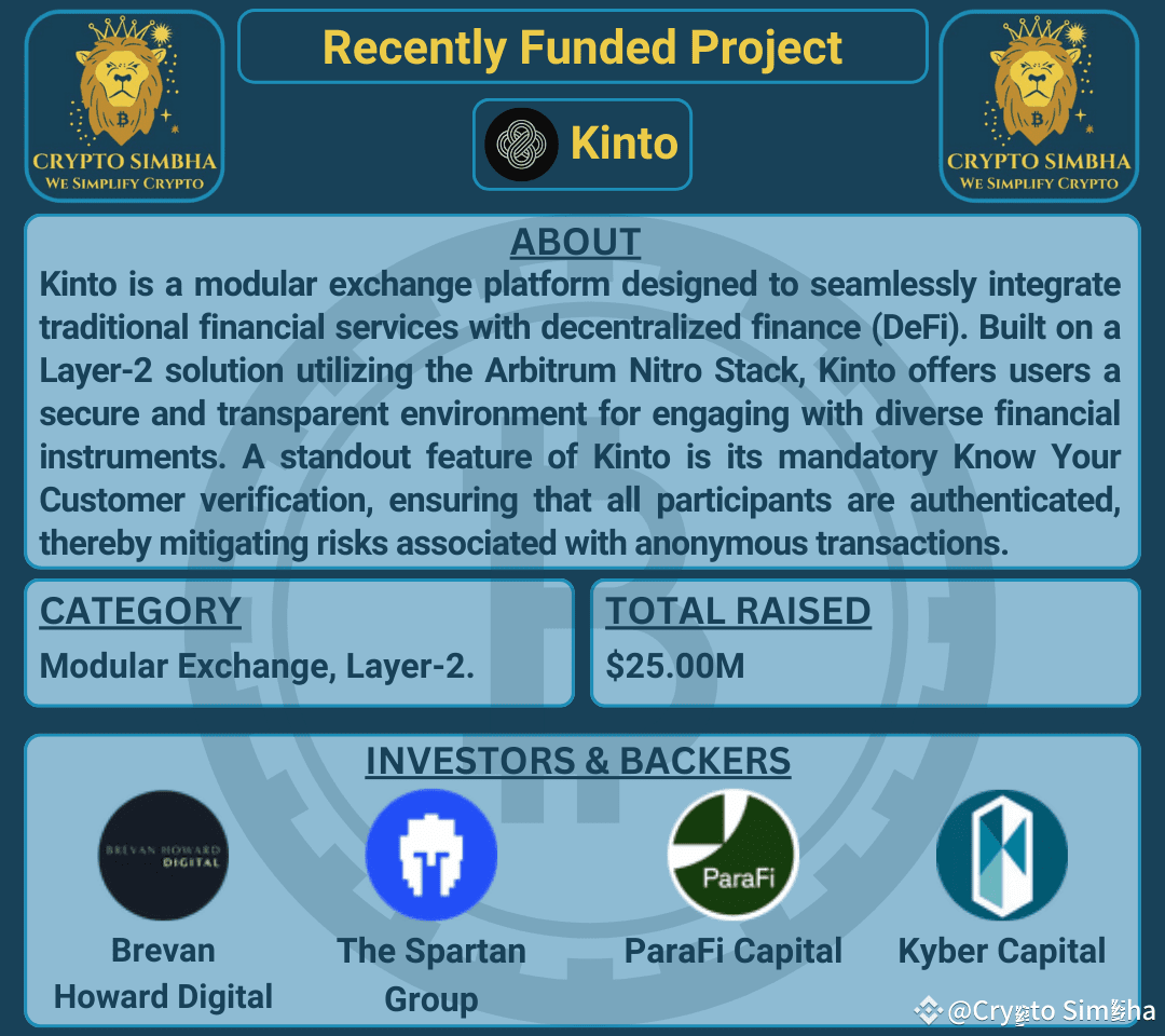 🔹About: Kinto is a modular exchange platform designed to seamlessly integrate traditional financial services with decentralized finance (DeFi). Built on a Layer-2 solution utilizing the Arbitrum Nitro Stack, Kinto offers users a secure and transparent environment for engaging with diverse financial instruments. A standout feature of Kinto is its mandatory Know Your Customer (KYC) verification, ensuring that all participants are authenticated, thereby mitigating risks associated with anonymous transactions. This user-owned KYC approach allows individuals to maintain control over their personal information, revealing only the minimum necessary data to access specific services.