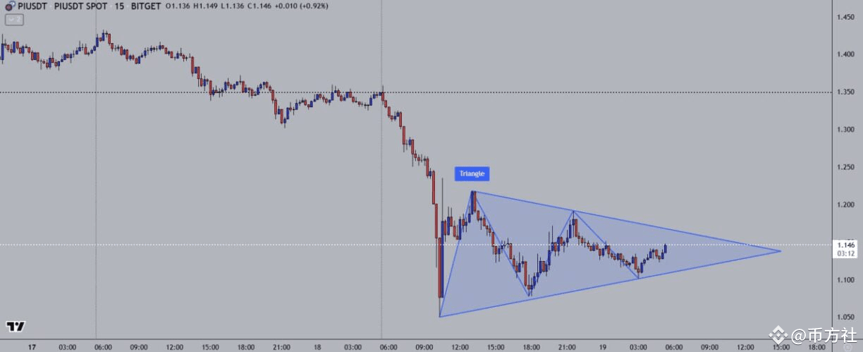 过去一周,Pi 币的价格承受着巨大的抛售压力,周线图上下跌了 23%。随着市值跌破 80 亿美元,该山寨币现已从第 11 位下滑至第 16 位。此外,Pi 币的日交易量增长了 15.87%,达到 6 亿美元。尽管出现了这样的发展,市场分析师仍然看好该山寨币。Pi Coin 的 15 分钟价格图显示对称三角形模式,暗示即将出现突破。