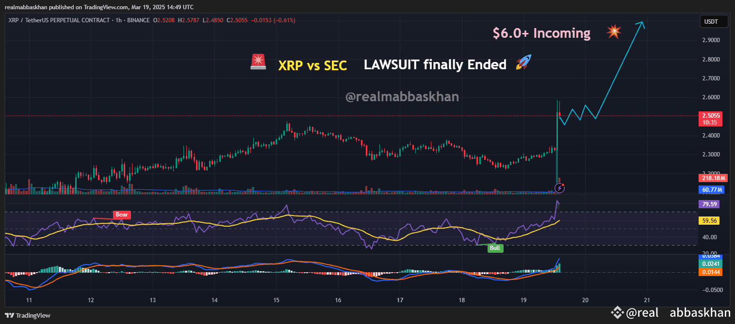 —Looking at the XRP/USDT chart (1H Binance), you can see that 218M+ volume poured in as soon as the lawsuit news broke. The RSI shot up to 79, signaling strong bullish momentum, while the MACD flipped green, confirming further upside potential. This isn't just a small pump – this could be the beginning of XRP’s long-awaited moon mission! 🌕
