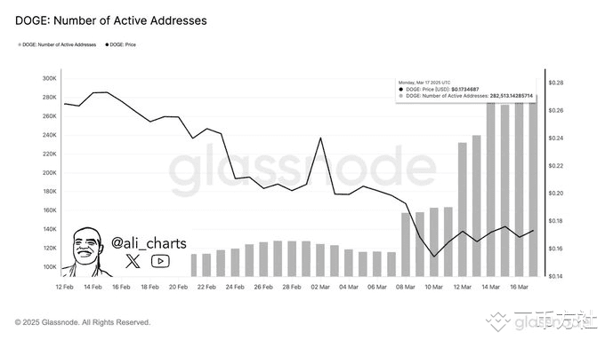 尽管有看跌信号,但狗狗币网络的活跃度有所增加。据加密货币分析师Ali Martinez称,活跃地址数量显着增加,从 3 月 12 日的 150,000 个增加到 3 月 14 日的 280,000 个以上。