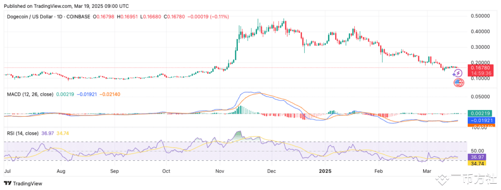 RSI 为 36.97,略低于中性 50 点。该水平表明 DOGE 处于超卖区域,如果继续跌破 30,则可能预示着进一步的抛售压力。