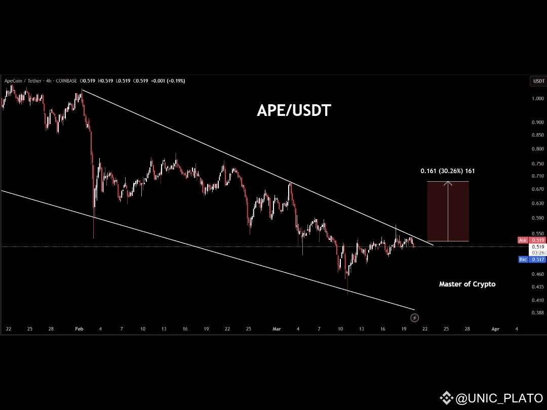 - APE is displaying a falling wedge pattern in the 4h timeframe.