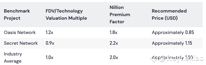 Based on available data and a benchmarking method comparing circulating market values, reference projects include Oasis Network, Secret Network, and the industry average. The table below illustrates the analysis: