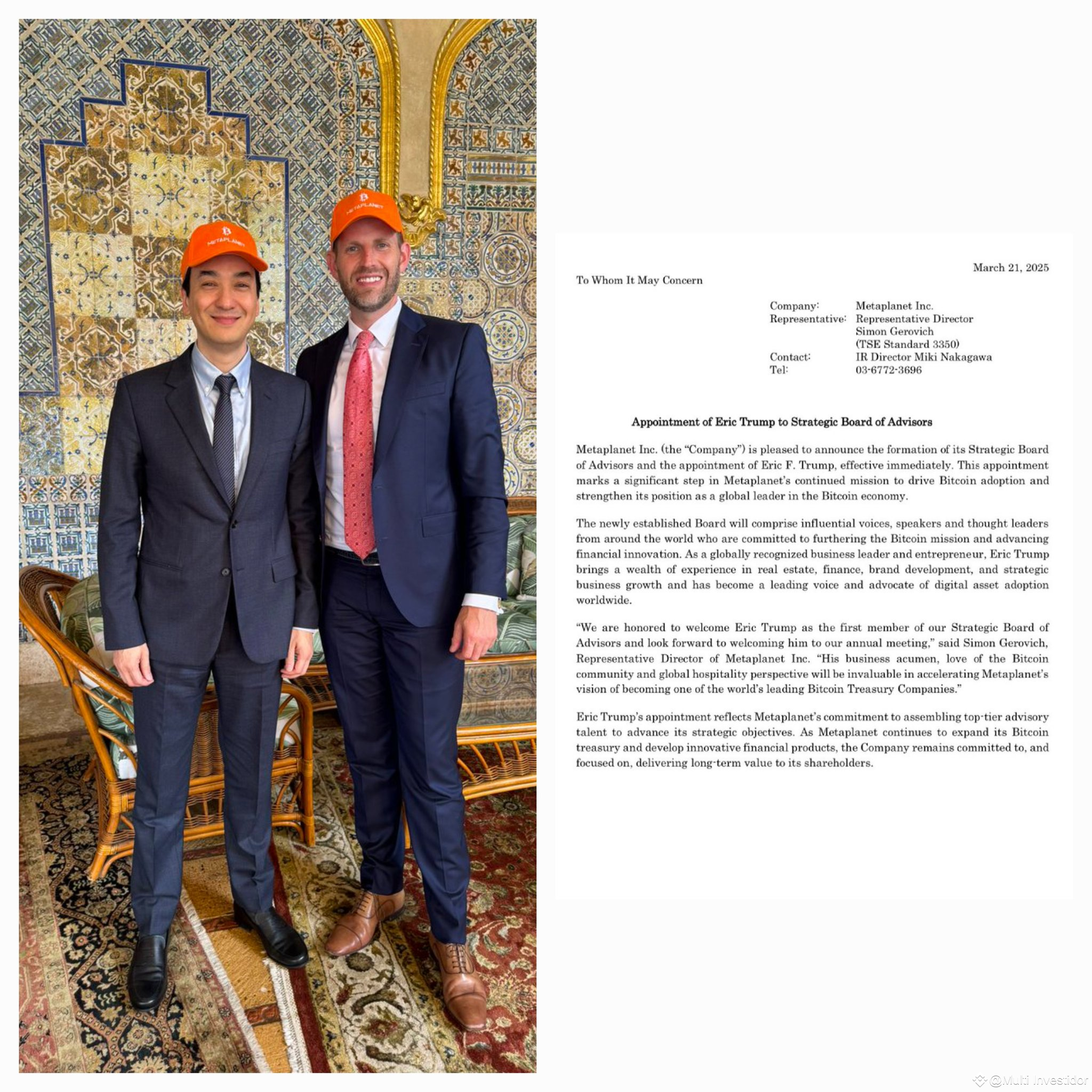 A Metaplanet afirma que chegada de Eric Trump à empresa envolve novo foco na área de ativos digitais, com compras.