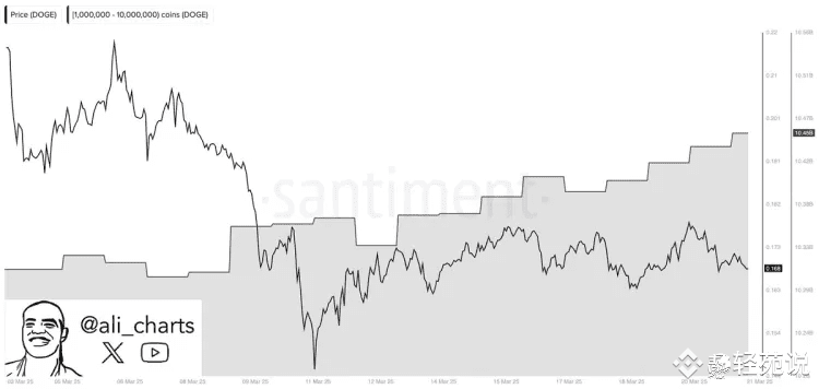 尽管市场情绪偏向谨慎,但链上数据却释放出积极信号。知名分析师 Ali Martinez 在 X 平台上分享的数据显示,过去一周,狗狗币鲸鱼地址累计增持超过 1.2 亿枚 DOGE。这种大额增持行为通常被视为看涨信号,表明大户可能正在为潜在的反弹行情做准备,尤其是如果狗狗币能够成功突破 0.18 美元的关键阻力位,则可能进一步提振市场信心。