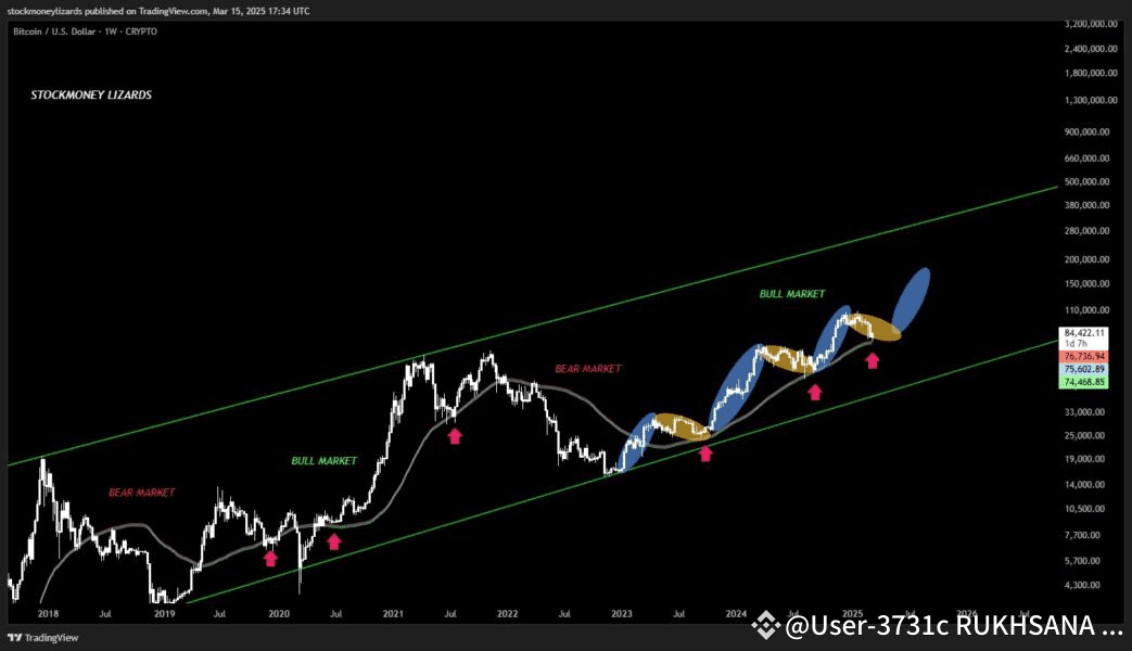 “While many are panicking and declaring a bear market, the long-term trend channel (green lines) remains firmly intact,” it summarized alongside a chart showing BTC price fluctuations around an average trend line during bull markets.