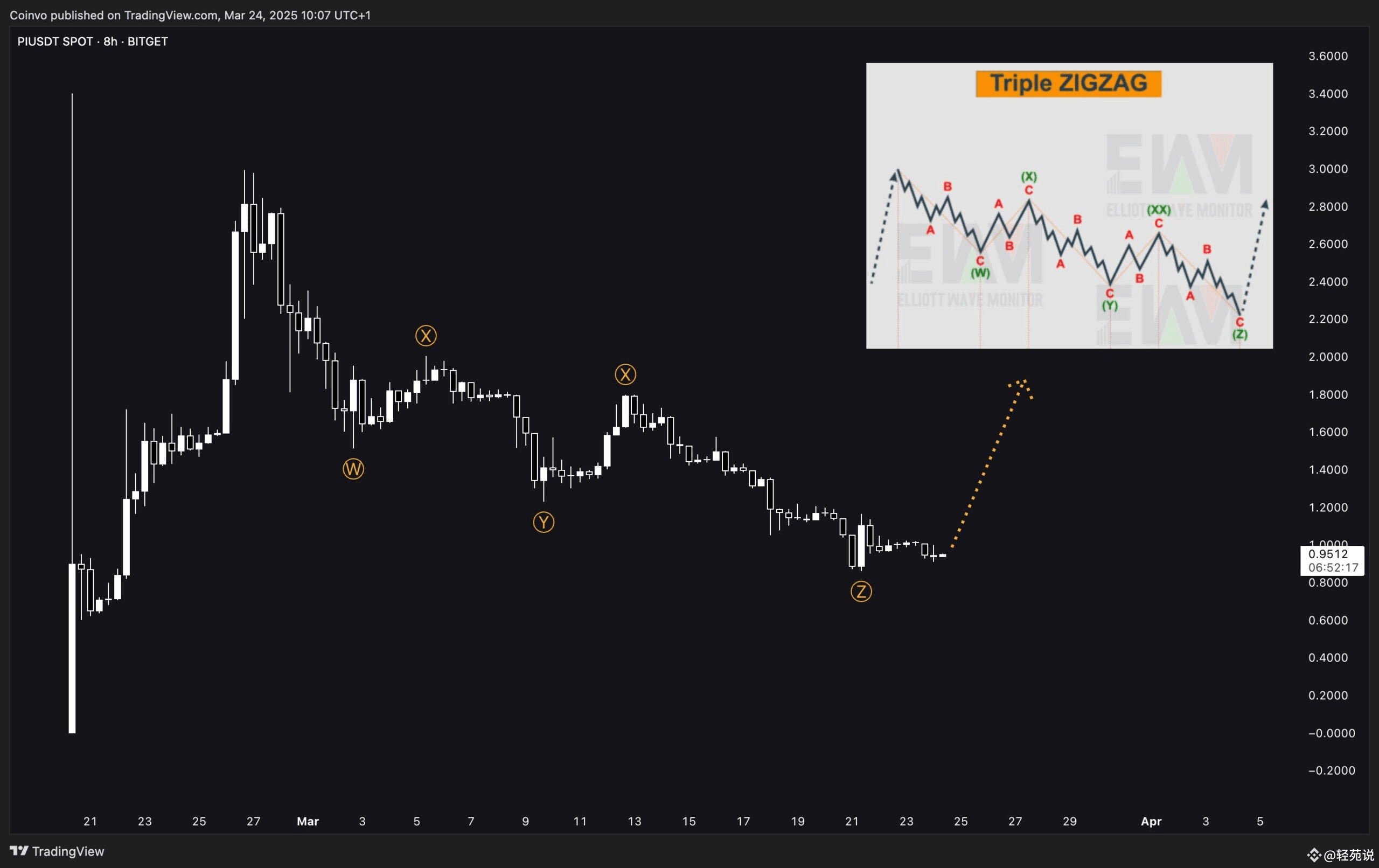Coinvo 最近发布的 TradingView 图表揭示了 Bitget 上 PI/USDT 交易对的复杂交易模式,突显了潜在的“三重之字形”形态,表明市场趋势可能出现逆转。