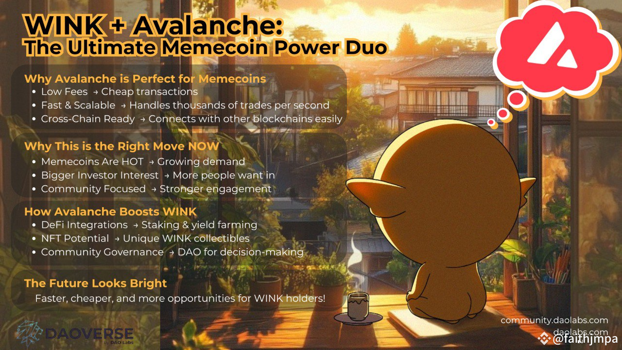 In the ever-evolving landscape of cryptocurrencies, the partnership between #Wink ($WINK) and #Avalanche (AVAX) emerges as a compelling alliance, particularly within the memecoin sector. This collaboration leverages Avalanche's robust blockchain infrastructure to enhance Wink's potential, offering notable advantages in scalability, transaction efficiency, and community engagement.