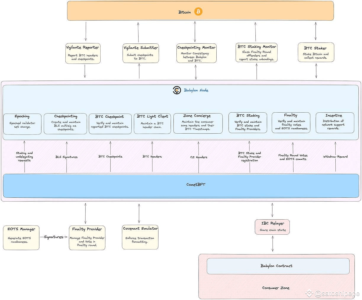 Đầu tiên, Babylon là blockchain layer 1 được xây dựng dựa trên CosmosSDK, mục tiêu của nó là tạo nên lớp xác thực cho các blockchain kết nối. Hai thành phần chính của Babylon là: