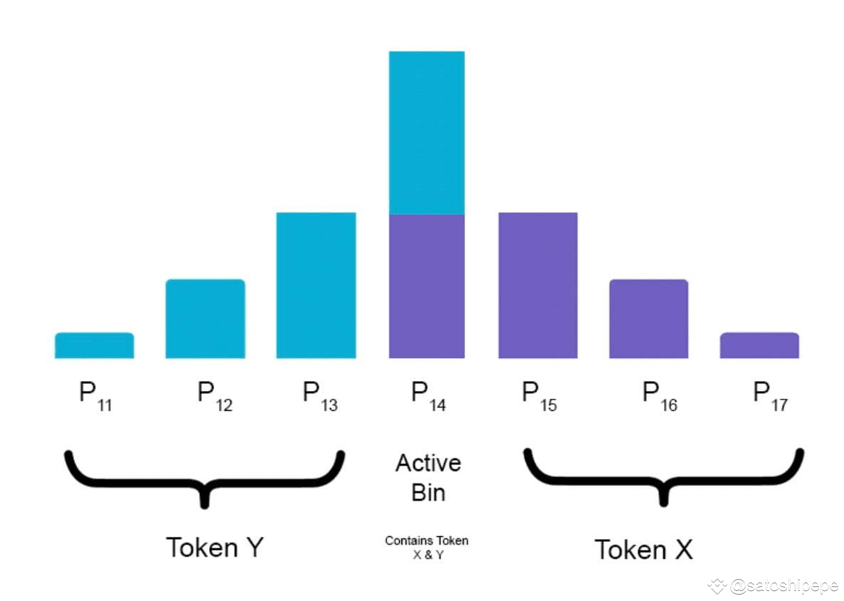Nhưng sau đây mới là điều thú vị của mô hình bin này, đối với các AMM thông thường cặp token X/Y sẽ được phân bổ trong một vùng giá (đối với CLMM) hoặc toàn bộ đường cong với mô hình truyền thống nhưng với DLMM thì cặp X/Y chỉ luôn nằm gói gọn trong một thùng chứa (bin) duy nhất. Các bin phía bên trái của bin đang giao dịch (active bin) sẽ chỉ chứa token Y (tức nhu cầu bán) và các bin bên phải sẽ chỉ chứa token X (tức nhu cầu mua).