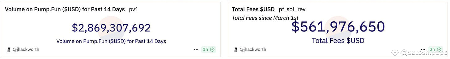 Không quá lời khi nói pump.fun đóng góp hơn 50% cho mùa uptrend của hệ sinh thái Solana. Có tổng cộng 7,8 triệu token được tạo thông qua nền tảng này, khối lượng giao dịch hàng tuần từ 1-2 tỷ USD mang về tổng cộng 561 triệu USD doanh thu cho đến thời điểm hiện tại.