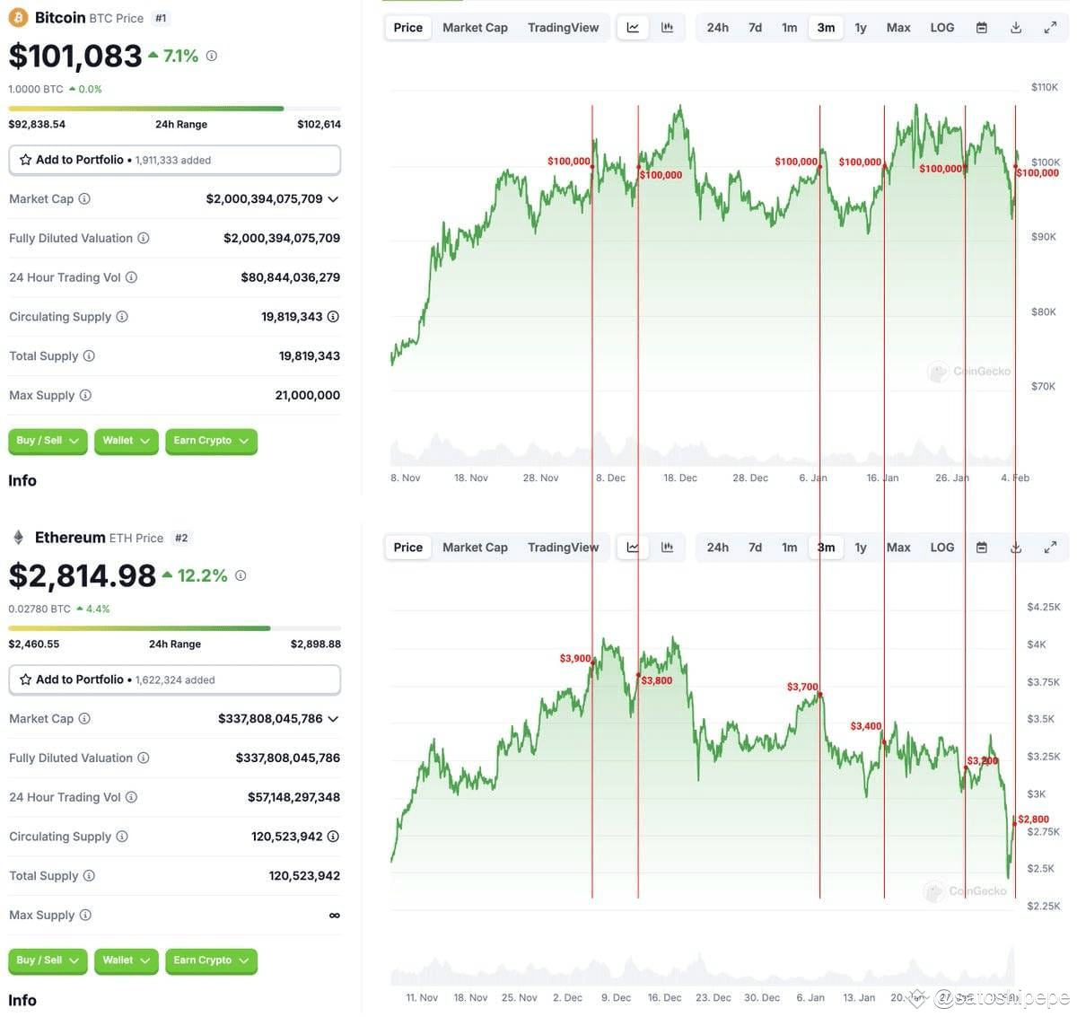 "Lần đầu tiên BTC đạt $100k, ETH đang $3k9Lần thứ hai BTC chạm $100k, ETH $3k8