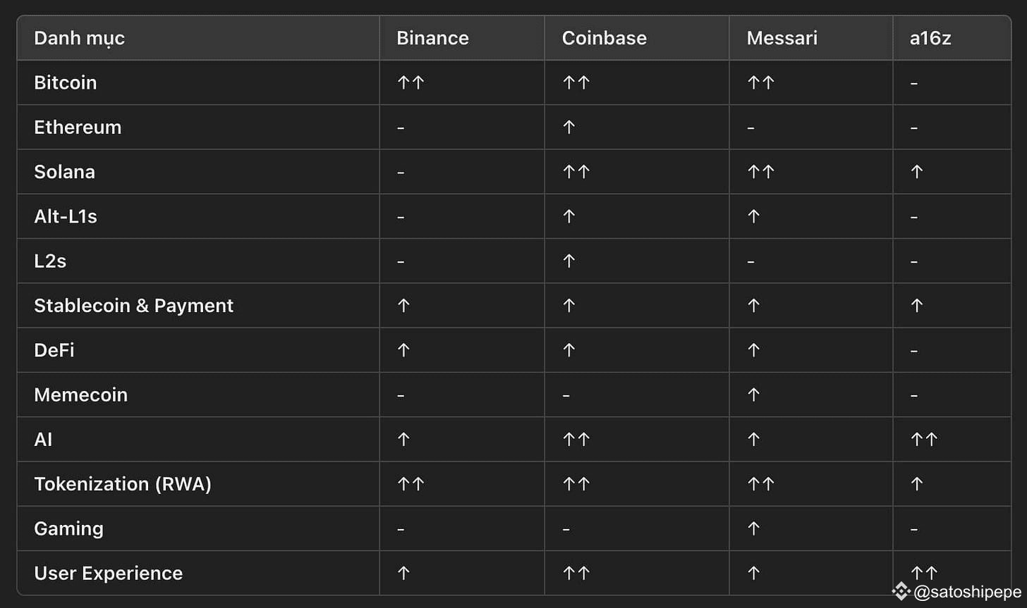 Xét tới các nhóm ngách thị trường, cả Binance, Coinbase, Messari và a16z đều nhận định rằng stablecoin, thanh toán, token hóa tài sản thực (RWA), AI và cải thiện trải nghiệm người dùng là những lĩnh vực có sự phát triển tích cực trong năm nay.
